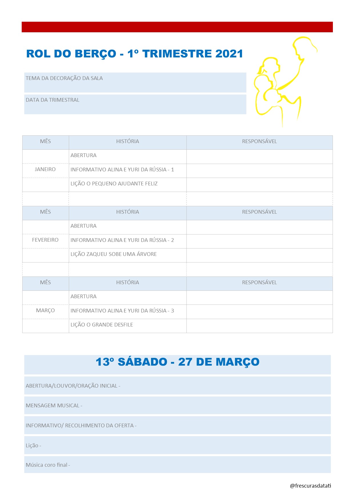 Imagine a alegria que é para as crianças chegar e encontrar a sala com uma cara nova e bonita. Então, sempre que puder mude o cenário e traga novidades que faça com as crianças se encham de entusiamo pela a escola sabatina. Vou deixar aqui novamente link de um grupo do facebook Trimestral IASD, muito legal e cheio de ideias. E também o da página da Claudia Cadette – KDT Artes, ela faz um trabalho incrível. Além de aceitar encomendas de todo brasil ela também disponibiliza ideias e moldes.